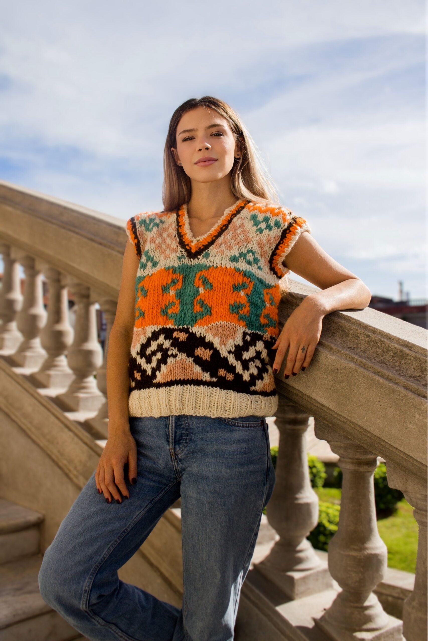 Chaleco tejido a mano en lana de Uruguay, de calce holgado y cuello con escote en v. Terminaciones cuidadas en puños y bastas. Talle único, similar a un M/L.