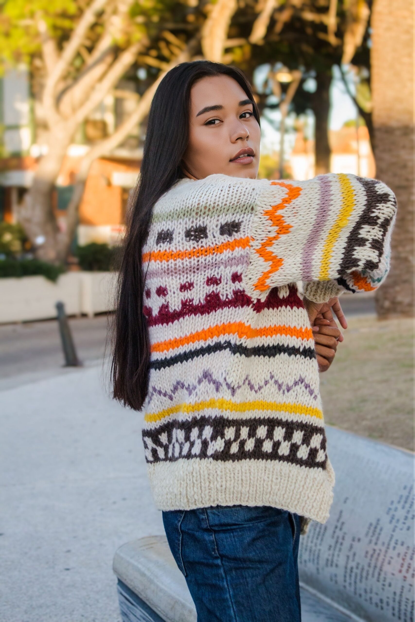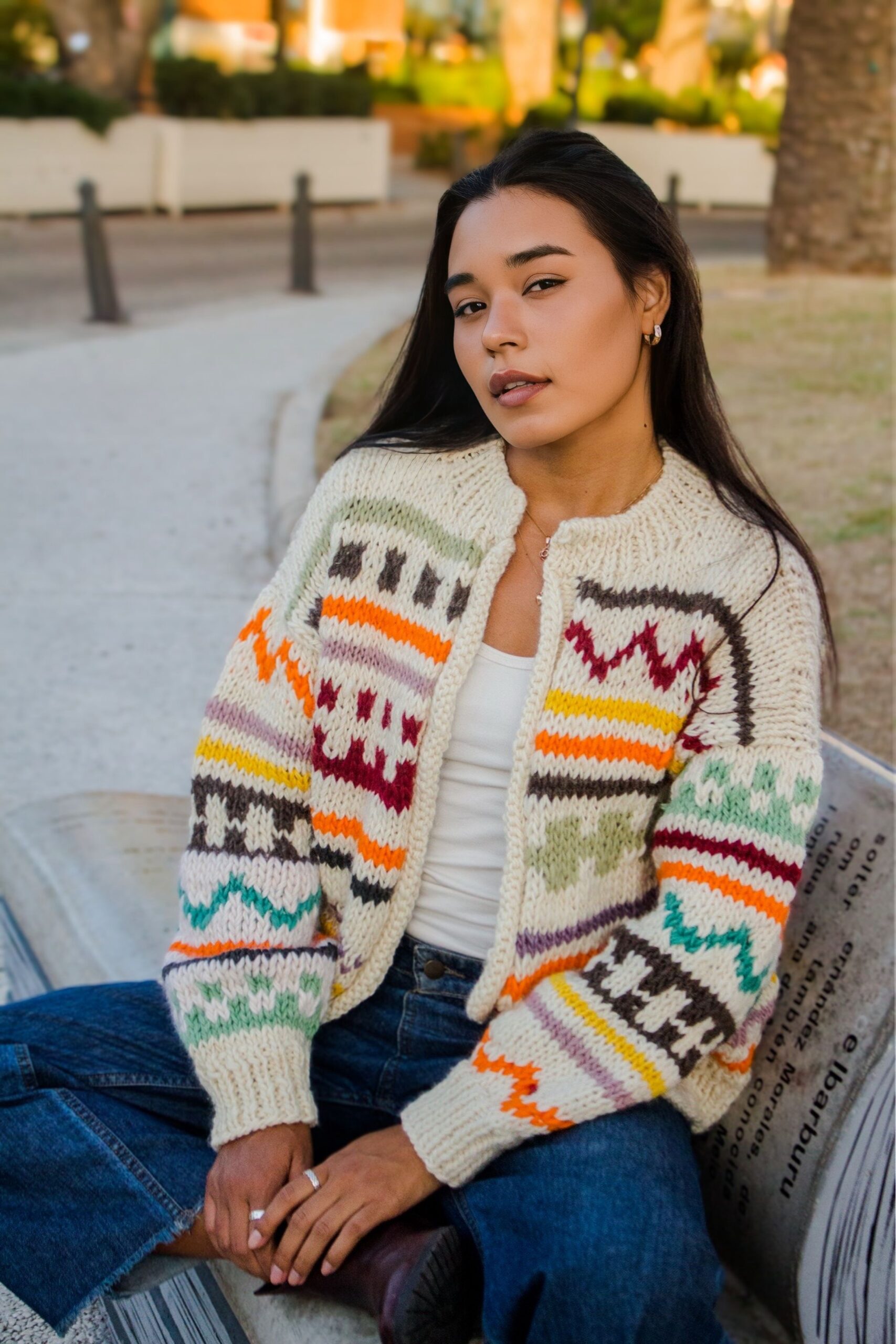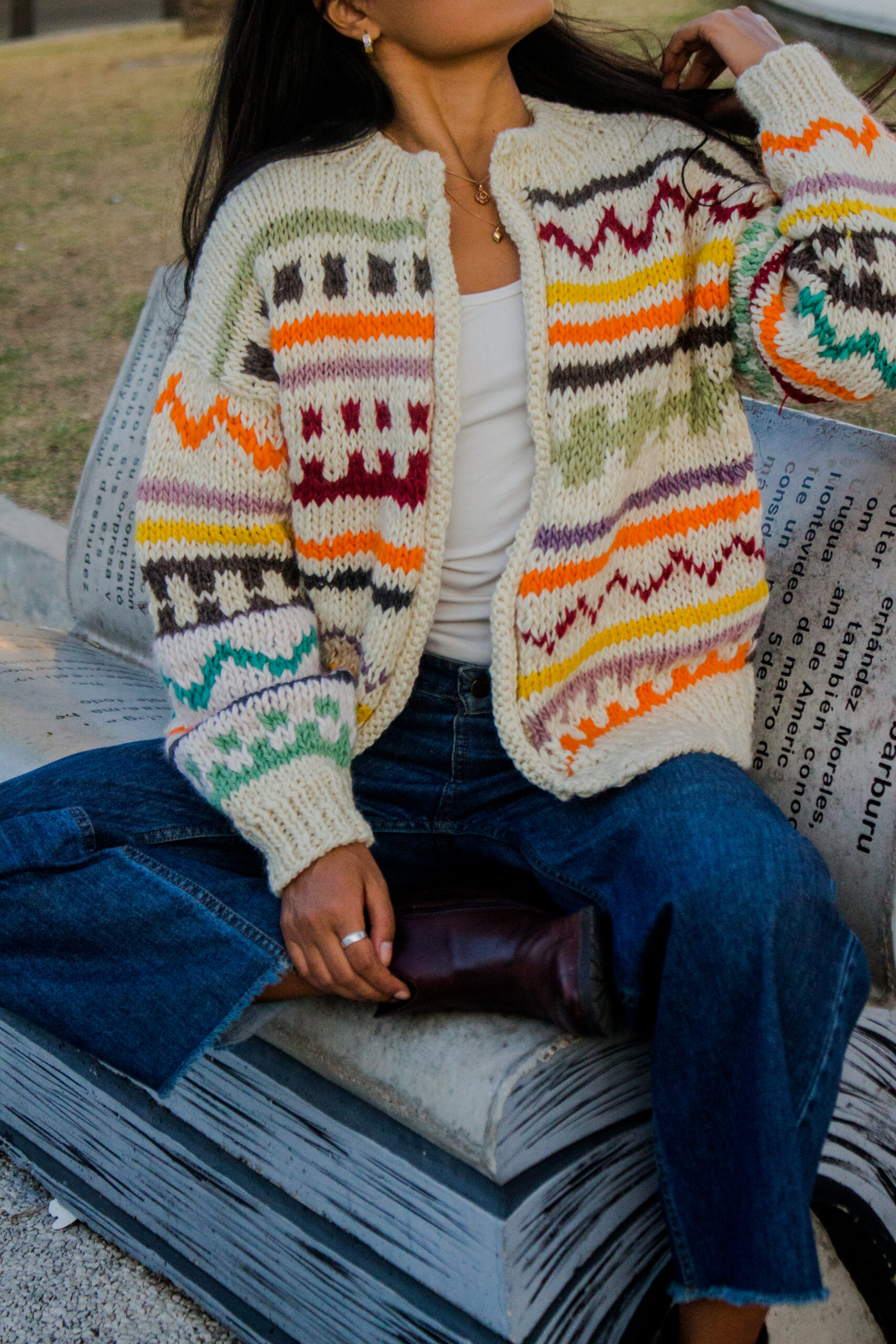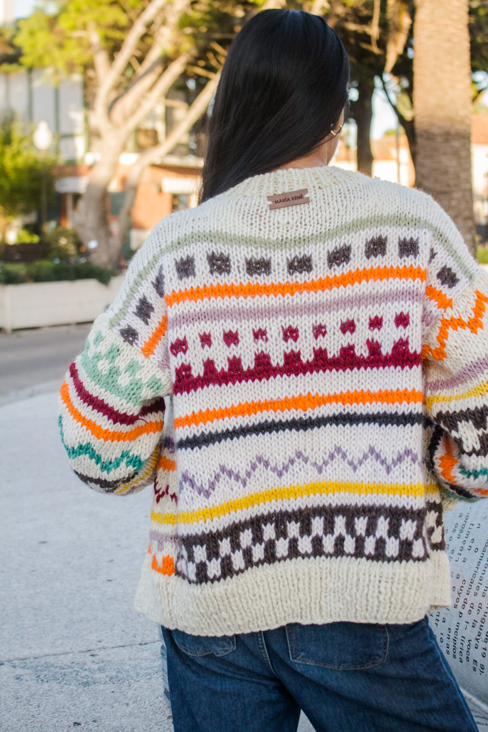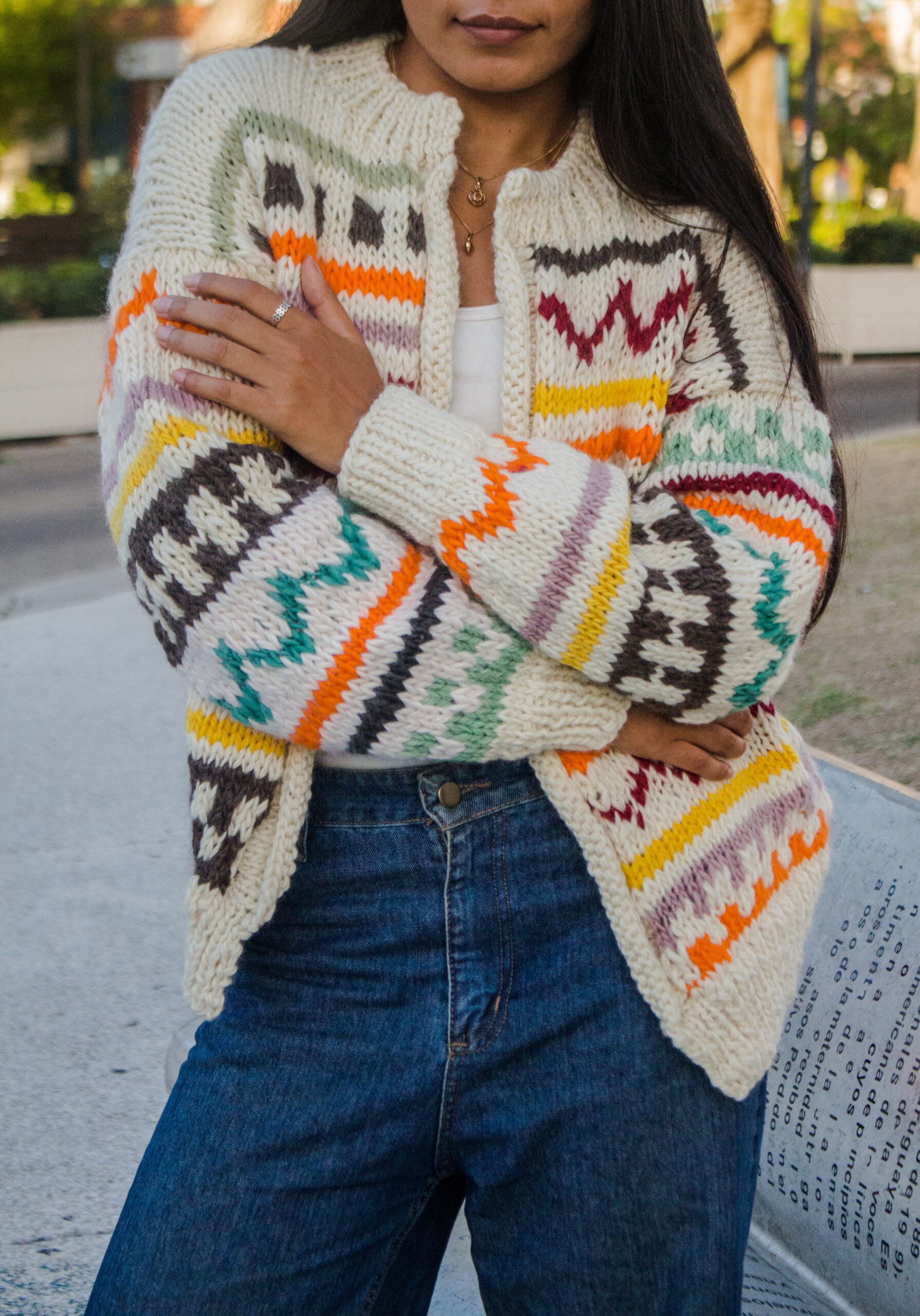Saco tejido a mano en lana natural, con combinación de guardas y motivos que recorren toda la prenda y la dan identidad propia. El trabajo de color y textura hace que cada saco sea diferente, convirtiendolo en una pieza única.