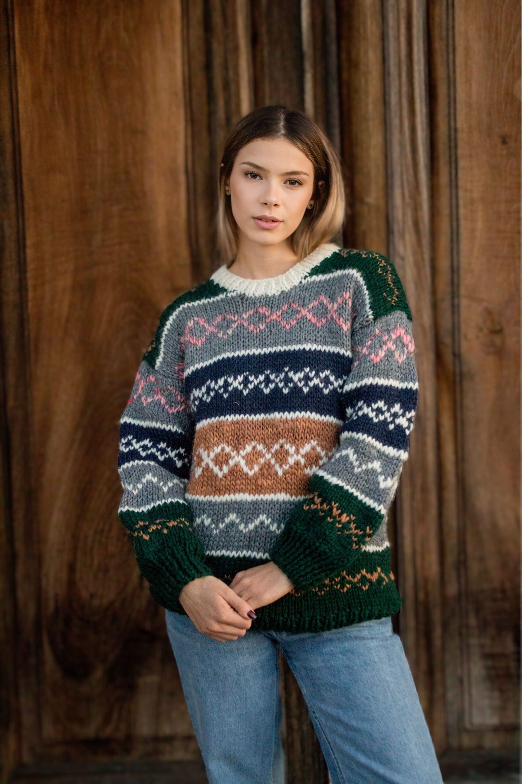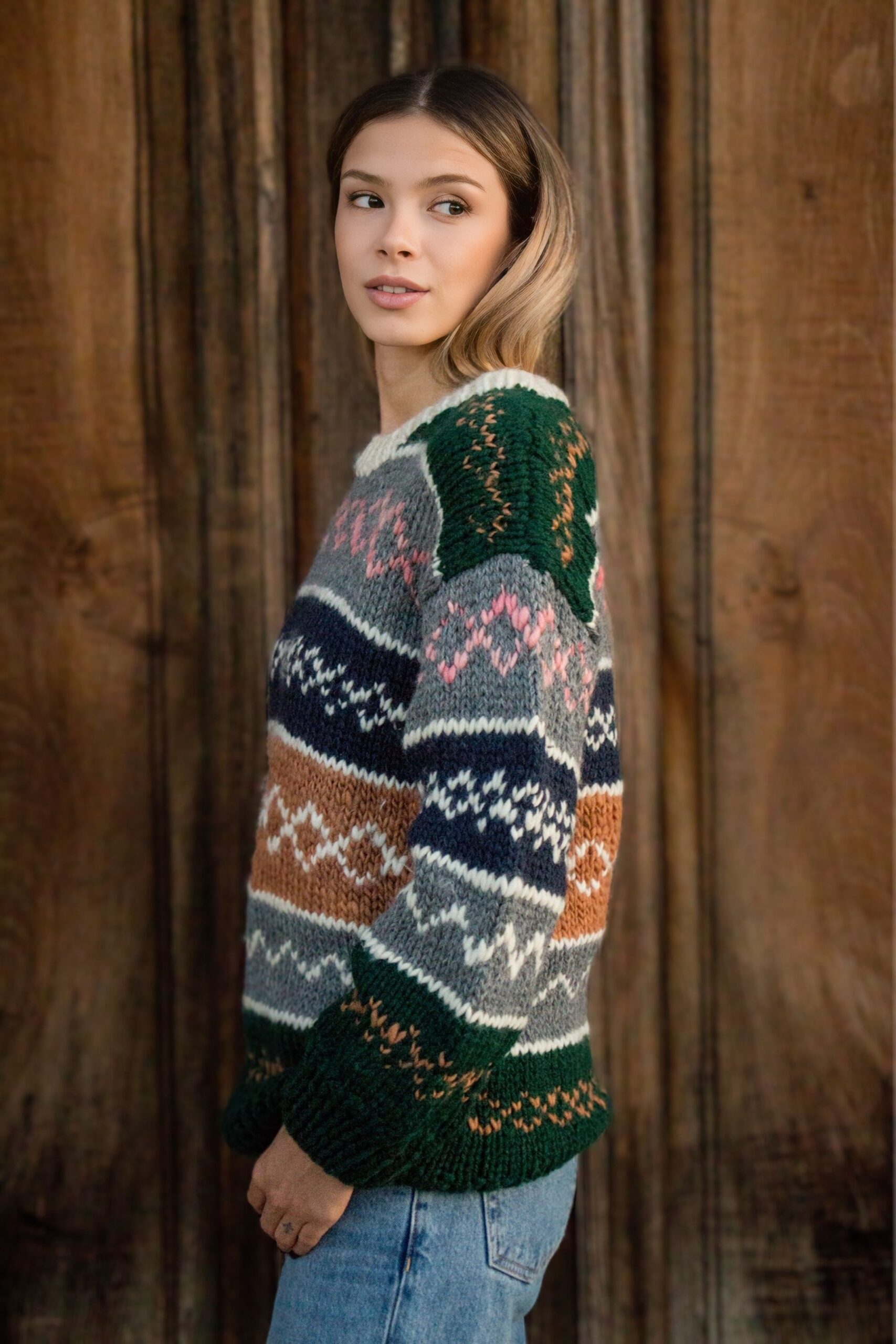 Buzo simil bariloche, tejido a mano en lana merino de Uruguay, con figuras que destacan en color sobre la base natural. Super holgado, talle único.