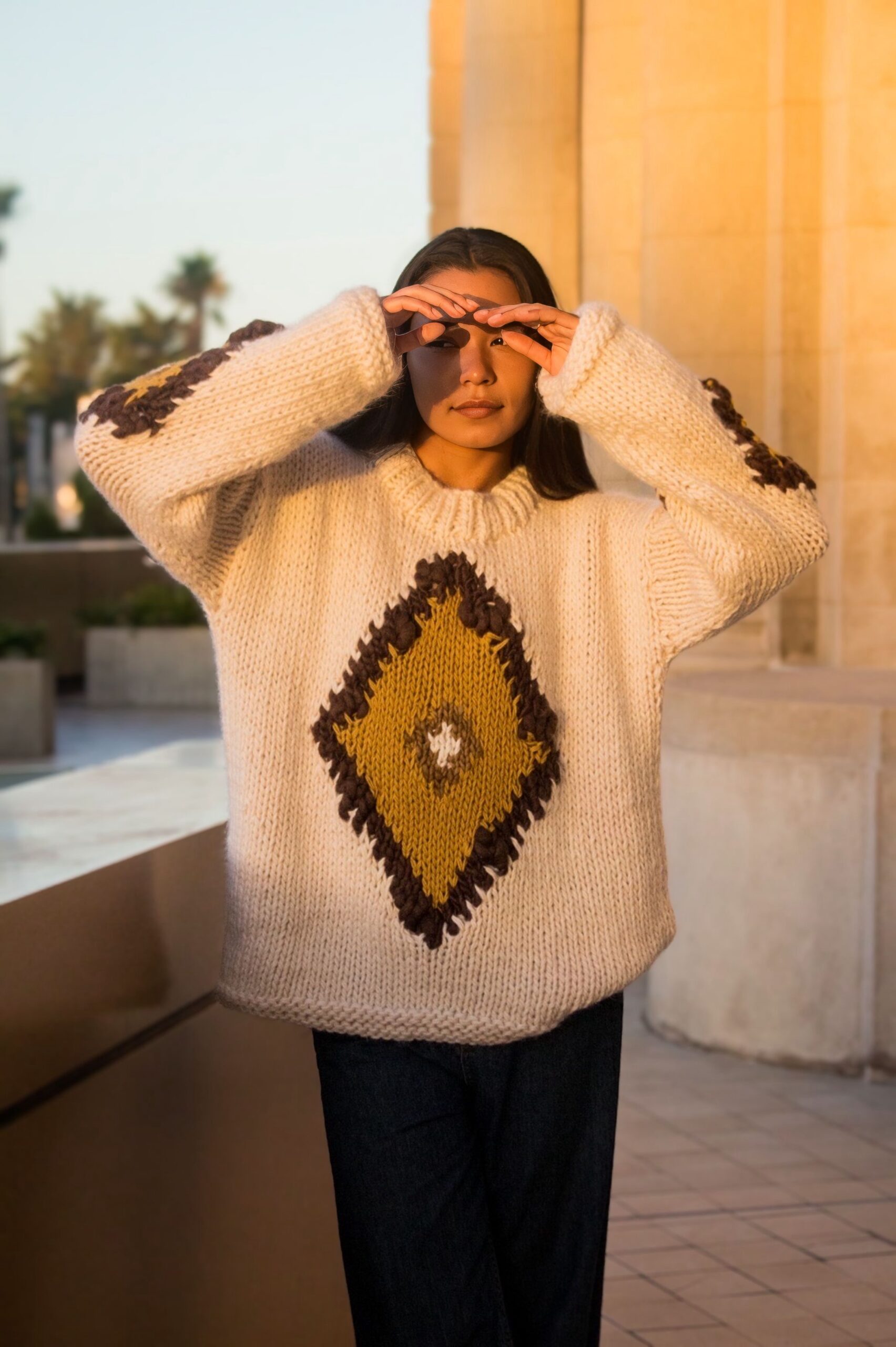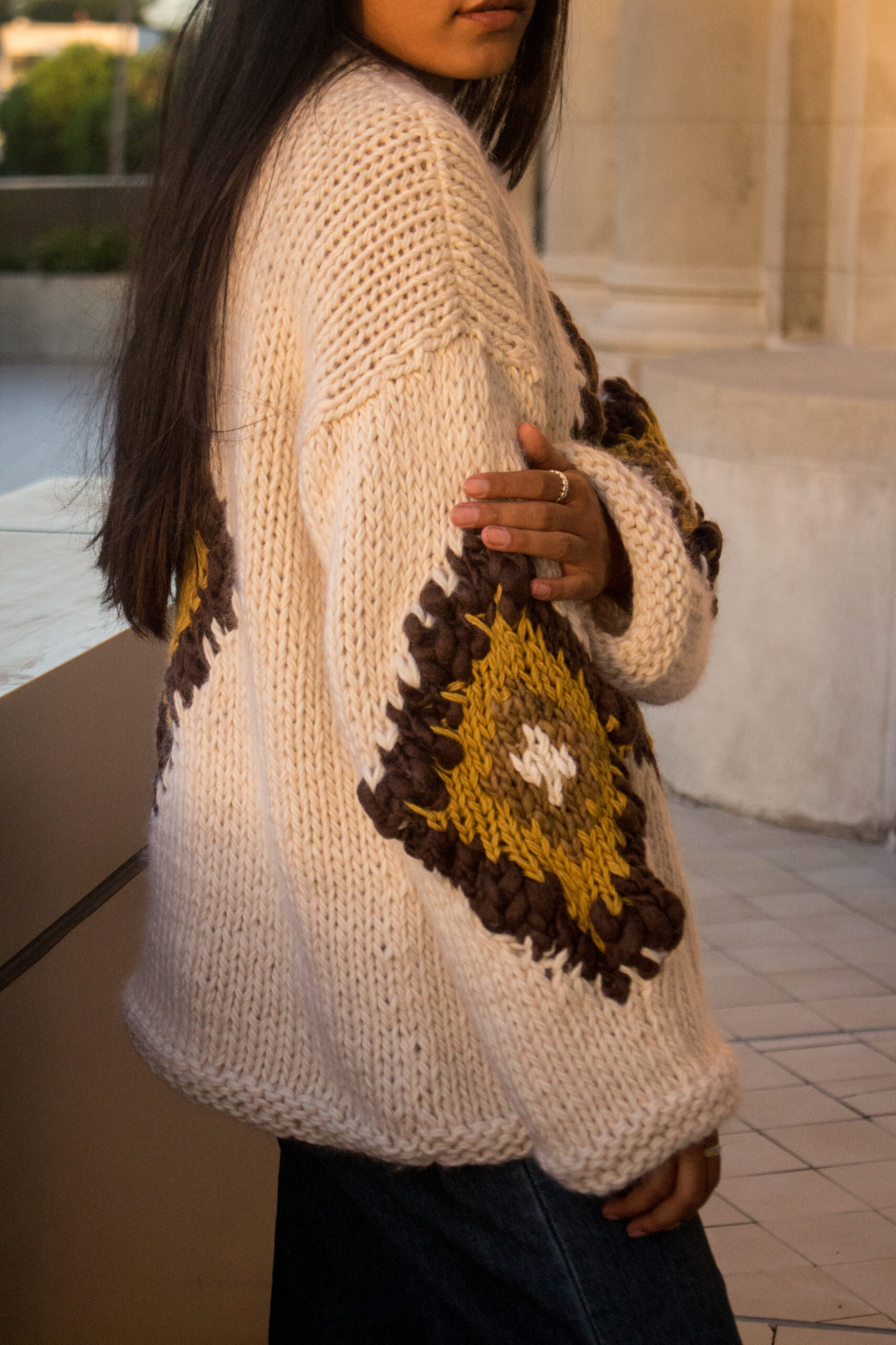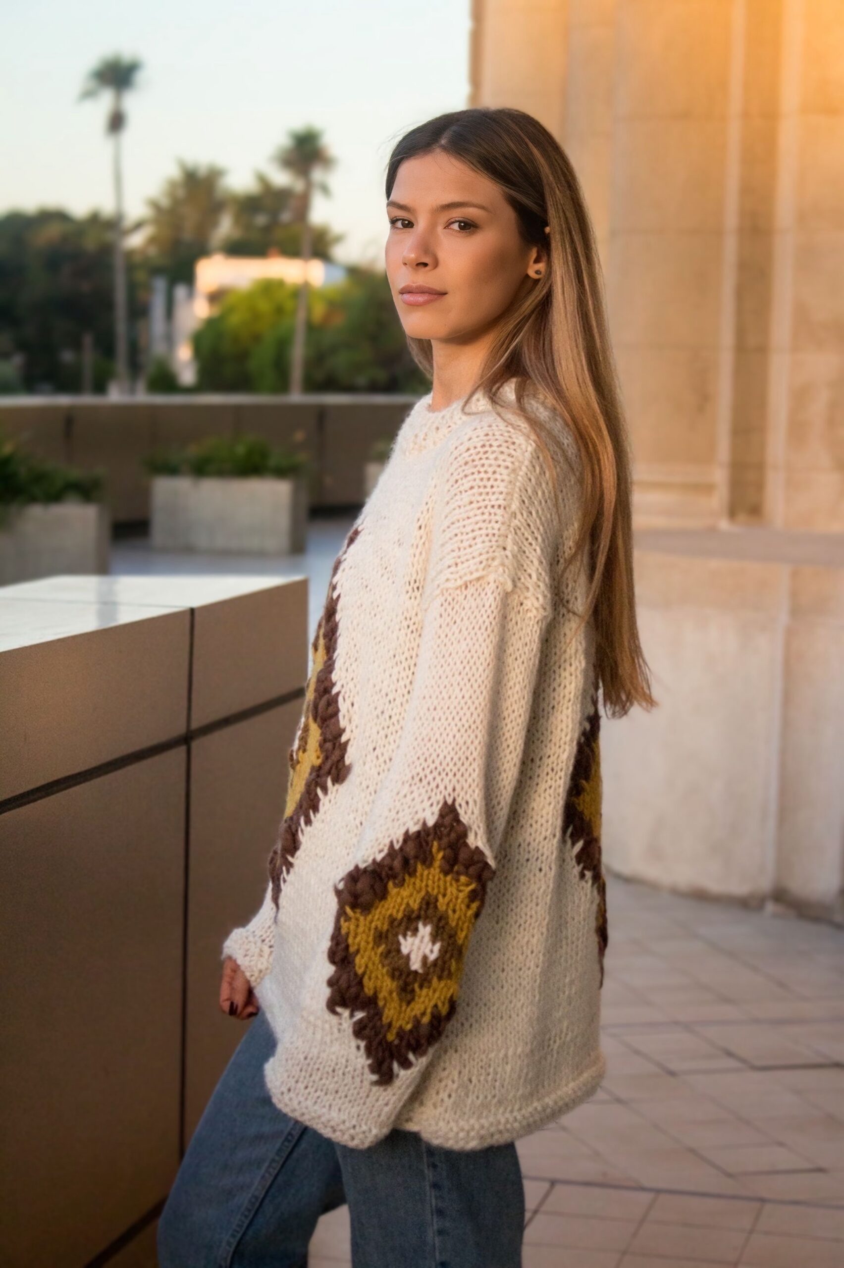 Tejido a mano en lana merino, con detalles en tintes naturales. Combina figuras, texturas y colores en un diseño con carácter propio.