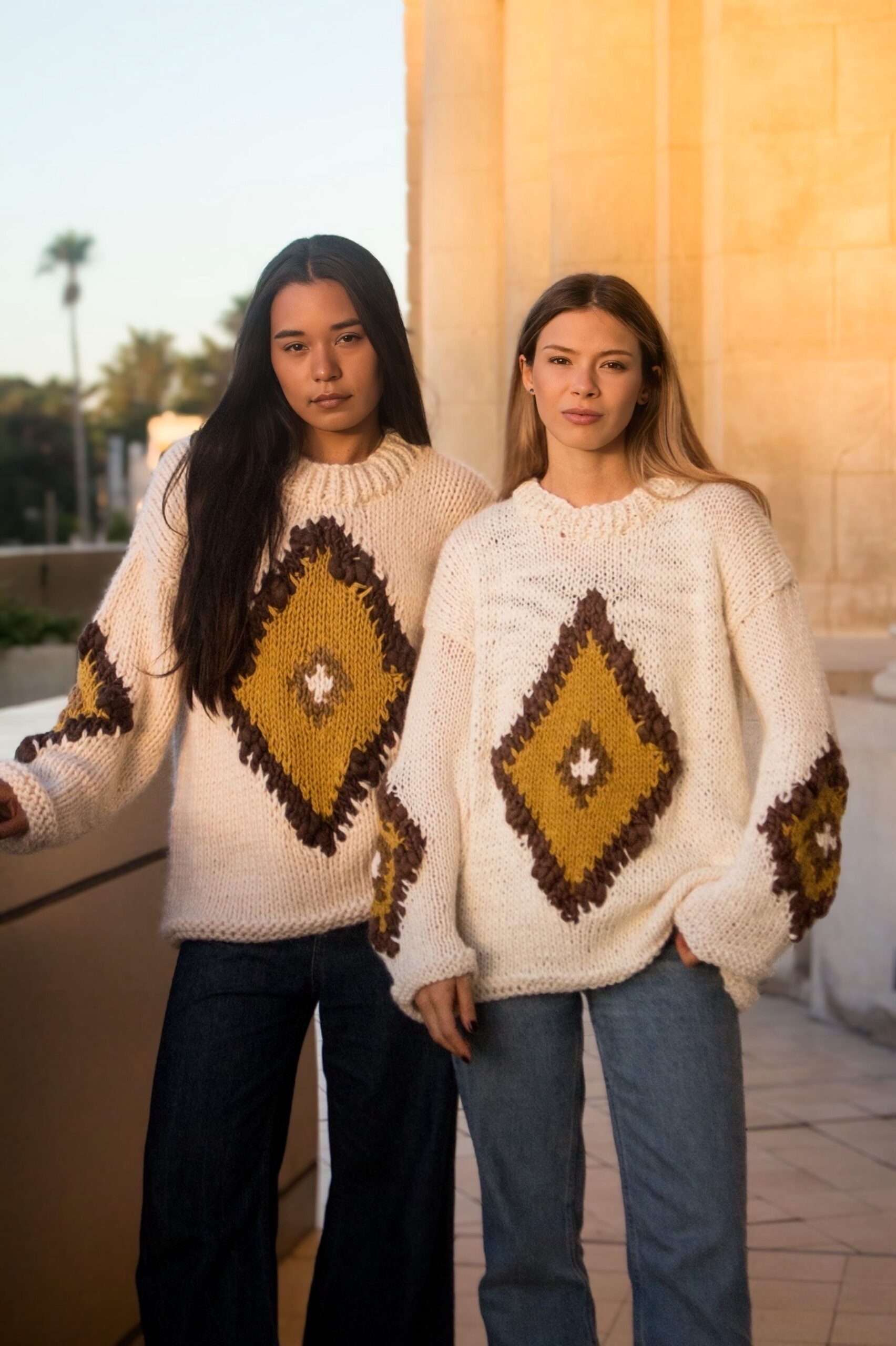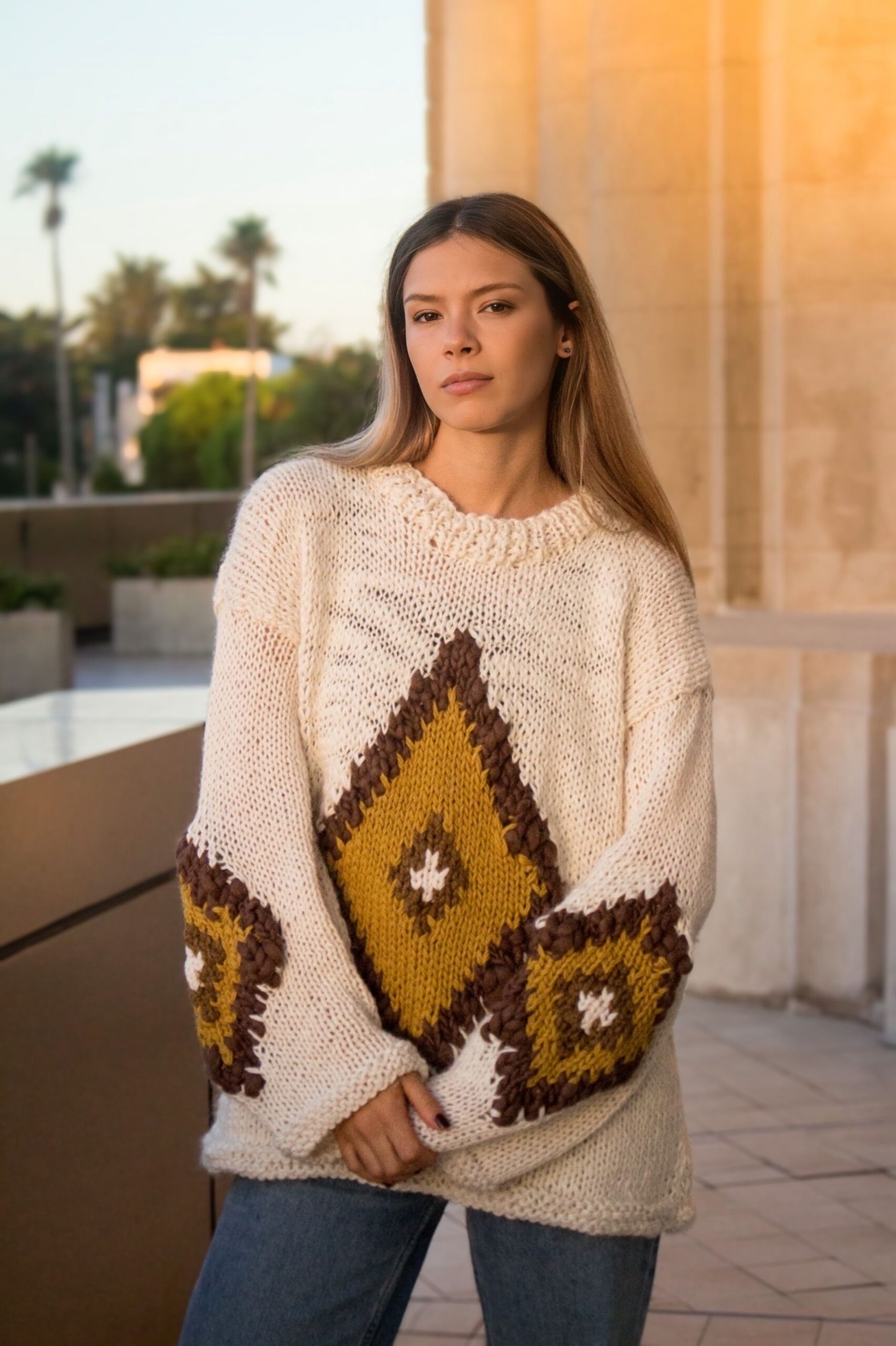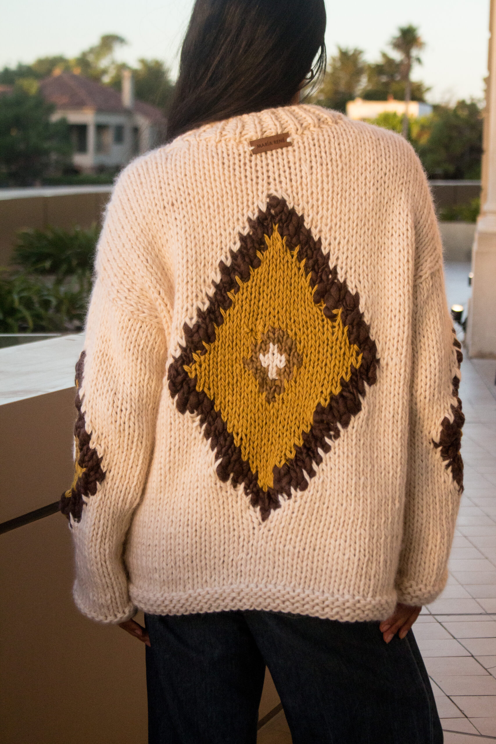 Tejido a mano en lana merino, con detalles en tintes naturales. Combina figuras, texturas y colores en un diseño con carácter propio.