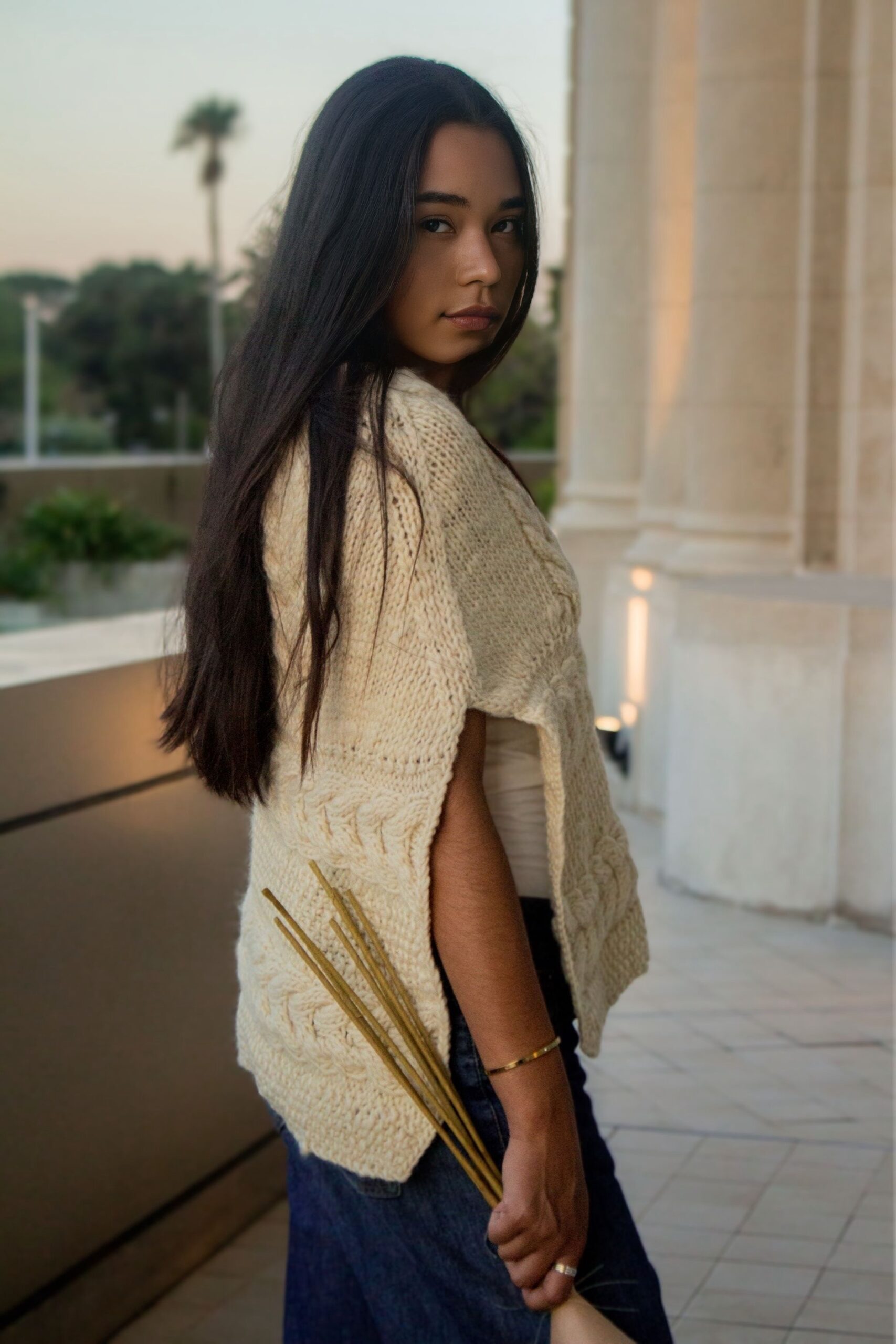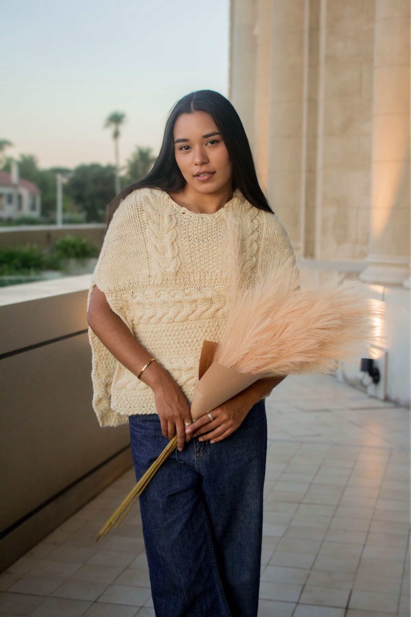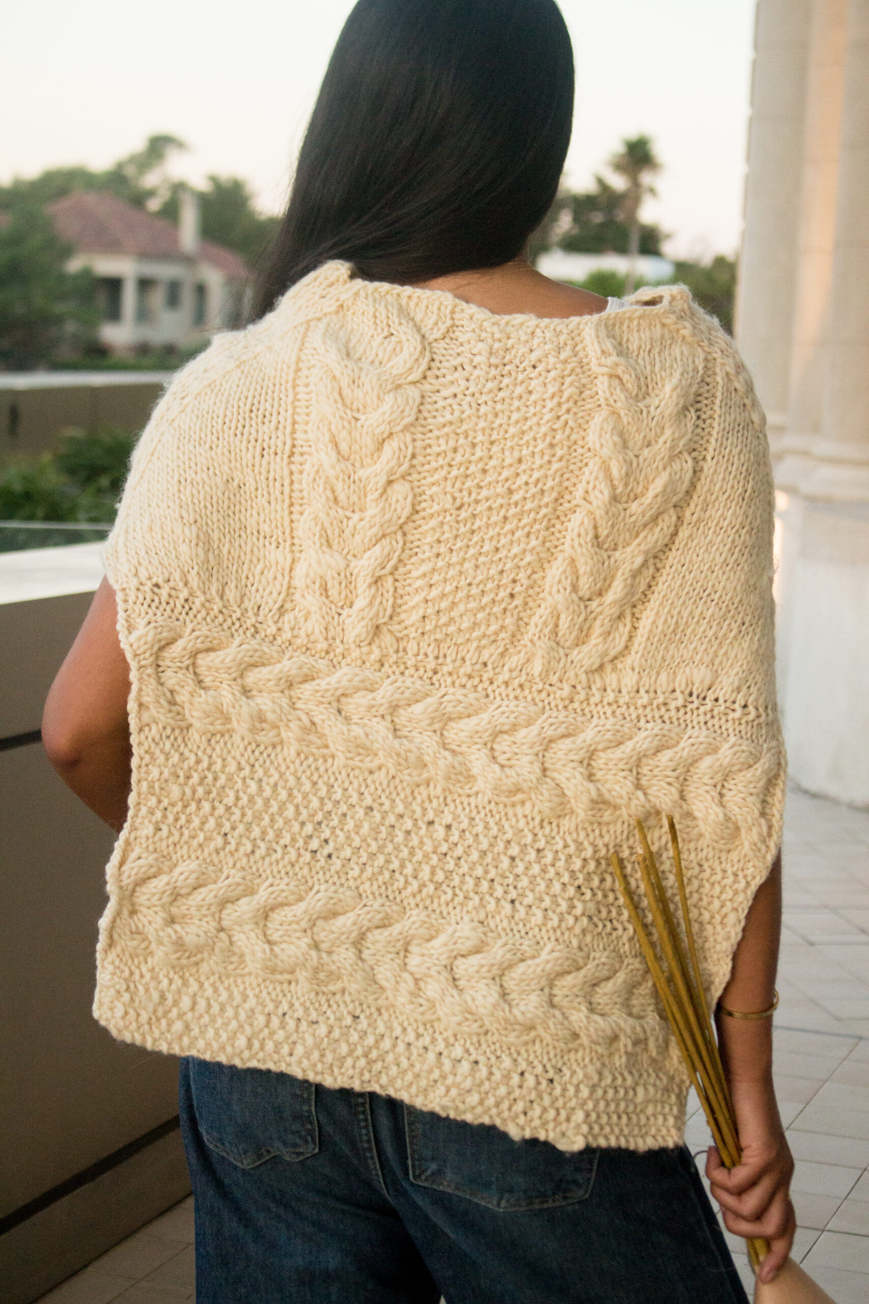 Ponchito tejido a mano en lana merino, con trenzas y figuras en relieve. Ideal para media estación. Talle único equivalente a un S/M.