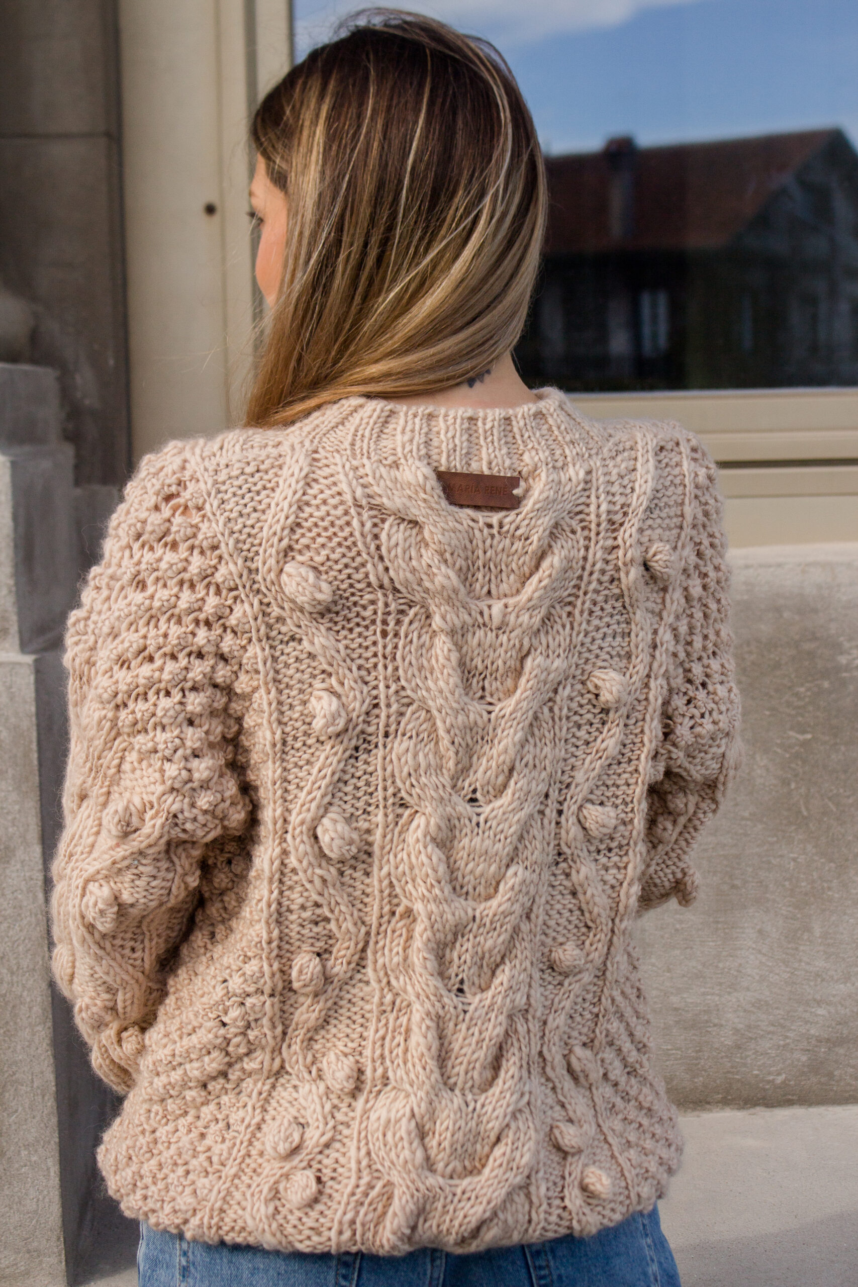 Buzo tejido a mano en tono aqua, con una trama protagonista que combina distintas técnicas y realza su carácter artesanal. El diseño destaca por su punto trenza (ochos) en el panel central, acompañado de bodoques en relieve (punto popcorn) que aportan textura y personalidad. La base está tejida en punto jersey, con sectores en punto texturado fantasía que enriquecen la superficie. Cuello y terminaciones en punto elástico para un mejor calce. Talle único, similar a un M/L.