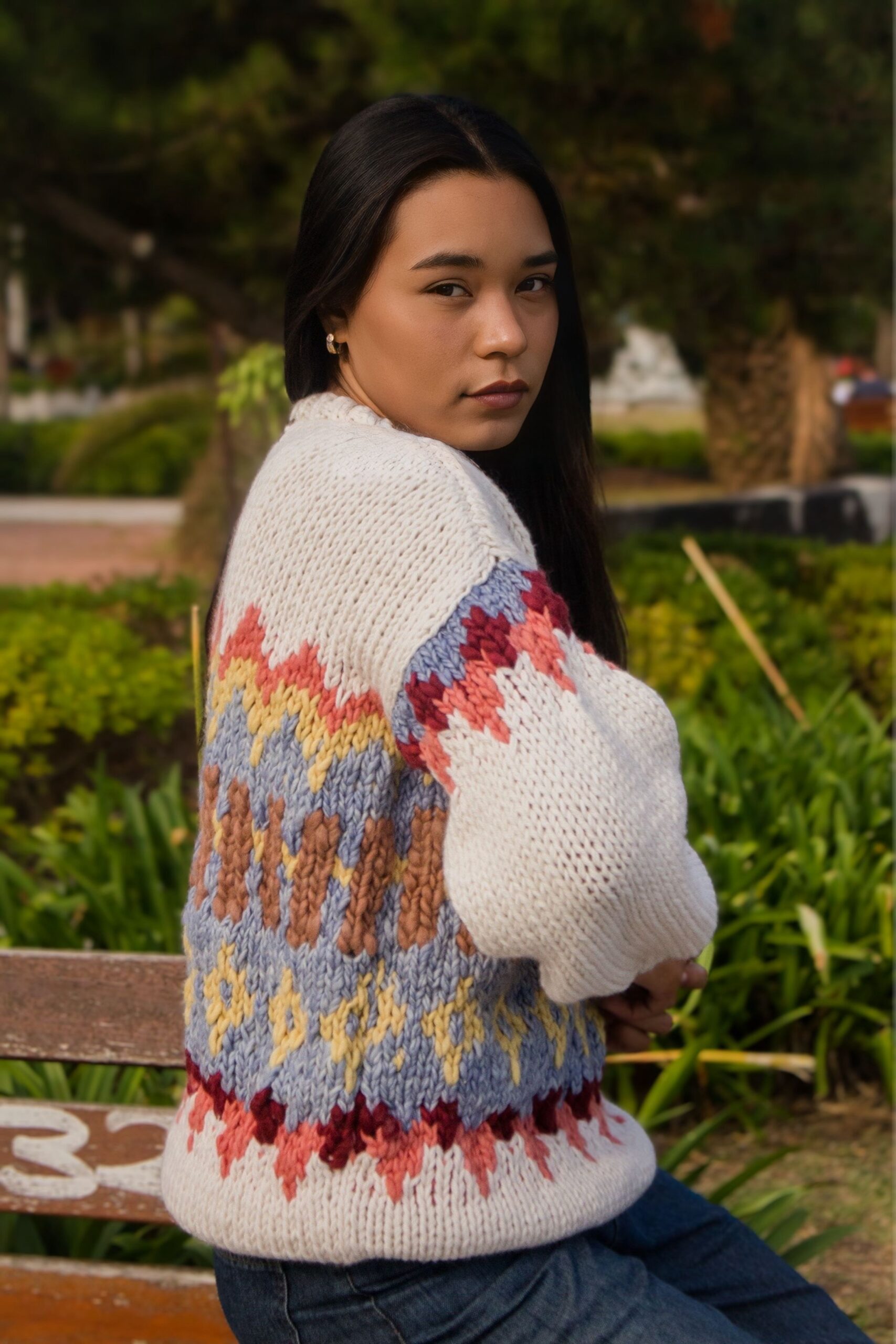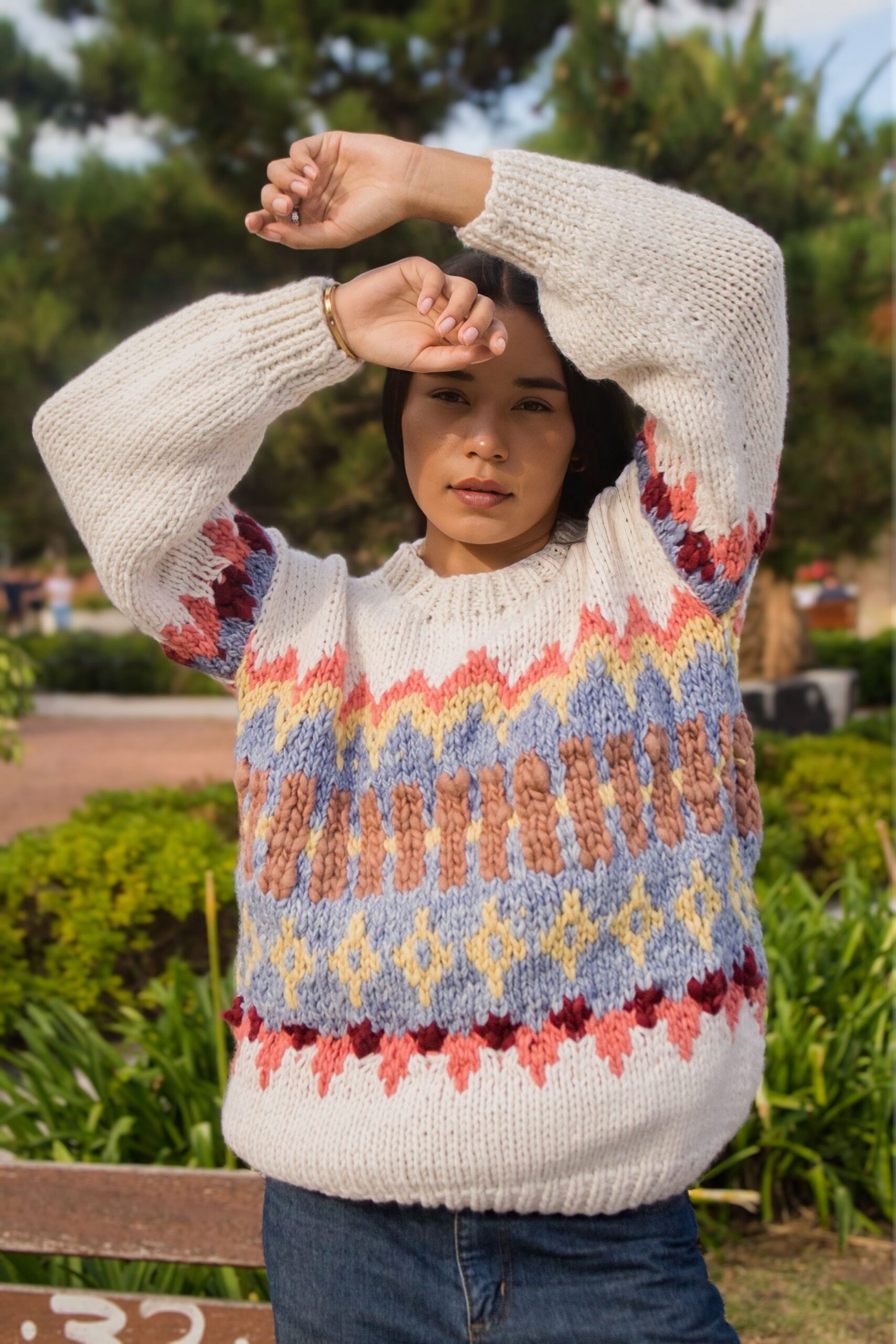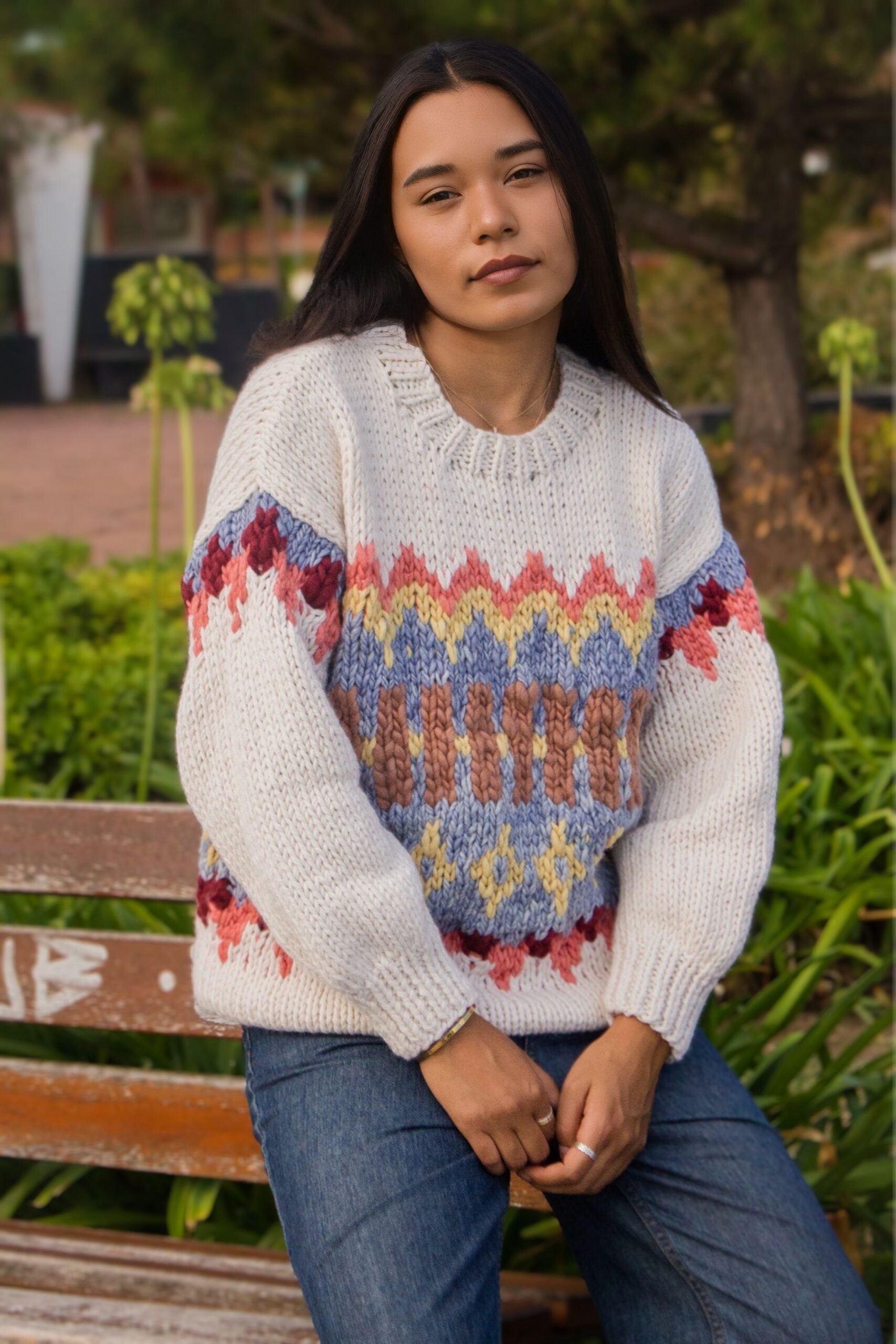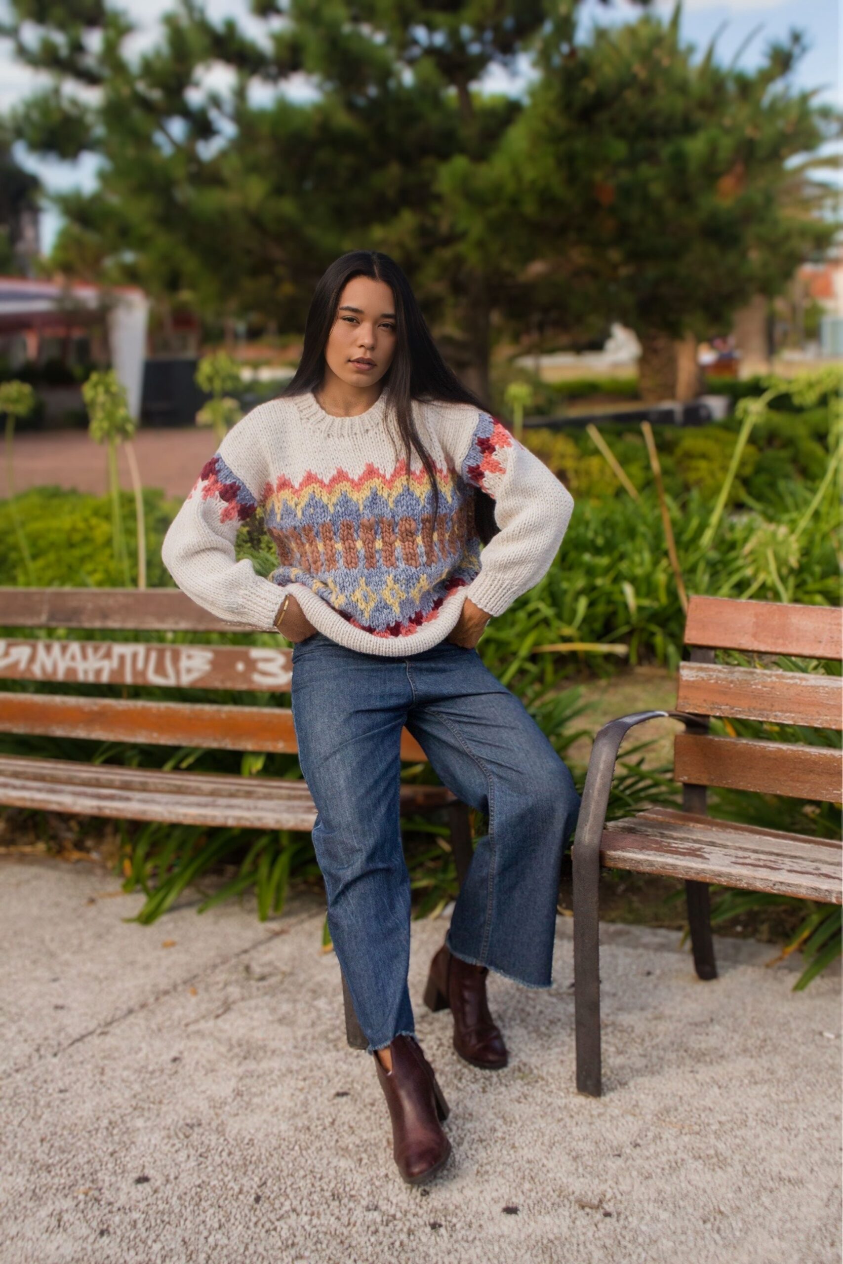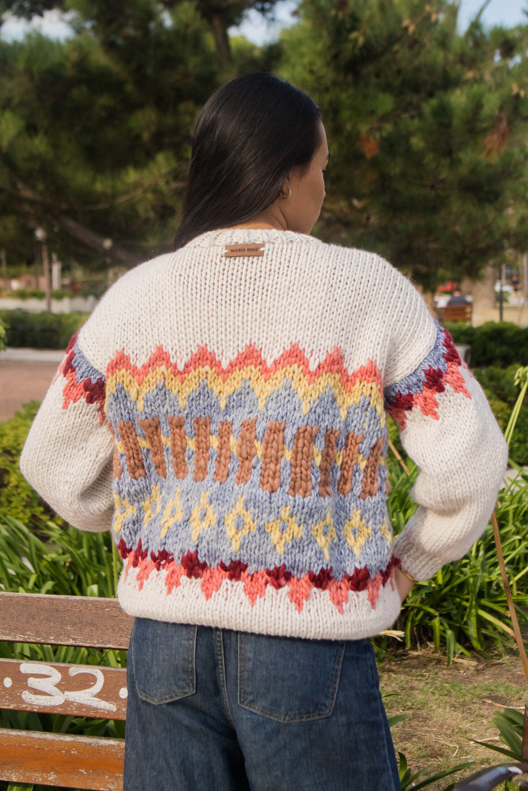 Lana tejida a mano, base natural con guarda colorida. Cómodo, abrigado y único. Talle único simil M/L.